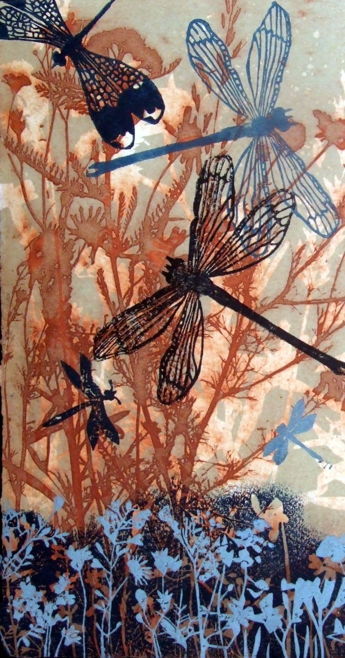 Mixed technique, solar and lino print. Float/window mounted 15 x 28cms